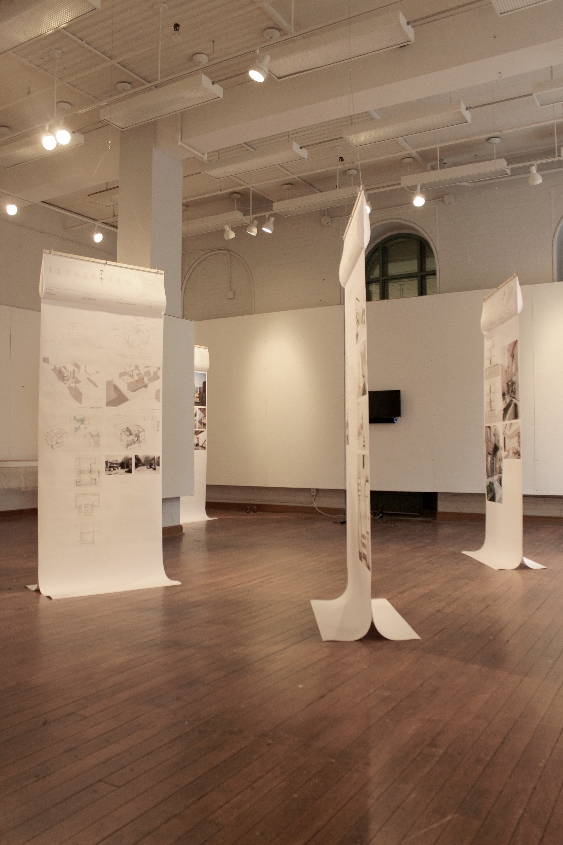 Our team of four was assigned with the planning, design and execution of this exhibition followed by discussion panel on the redevelopment of the Plateau neighborhood in Montreal. Due to the small budget allocated to this exhibition, we chose to layout the panels on 36" wide panels available at the school, and hang them from the exhibition room ceiling using airplane cable attached to the panels by plywood sticks. The panels were deliberately made longer than the height needed to the draft in the room and the movement of people during the vernissage would not create movement in them.